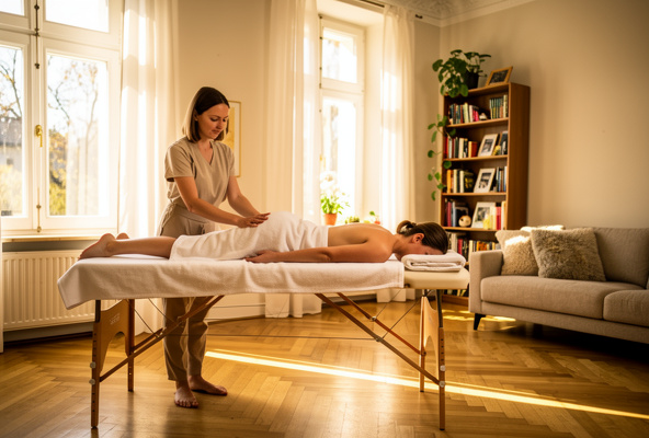 Die beliebteste Art, Massage Lab zu erleben. Ihr Therapeut stellt einen professionellen Massagetisch in Ihrem Wohnzimmer, Schlafzimmer oder einem anderen ruhigen Raum auf. Keine Anreise, kein Umziehen, keine Eile nach Hause – Ihr Sofa steht schon da. Verfügbar in allen Berliner Bezirken von Mitte bis Steglitz, Prenzlauer Berg bis Neukölln.