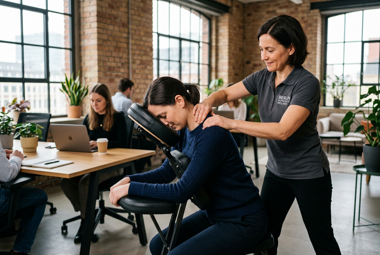 Vor-Ort-Stuhl- oder Tischmassage für Berliner Arbeitsplätze. Regelmäßige wöchentliche Programme, Team-Wellness-Tage oder Event-Massage für Konferenzen und Messen. Eine kluge Investition in die Gesundheit und das Wohlbefinden Ihres Teams. Kontaktieren Sie uns für ein kostenloses Angebot.